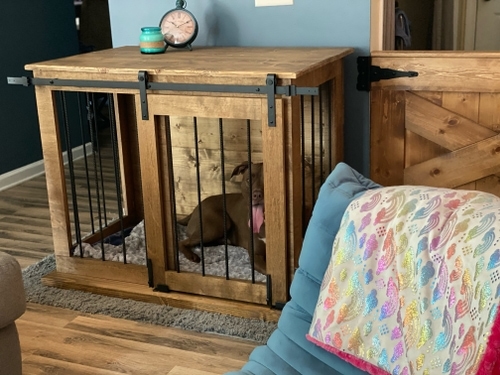 This Walnut Top with Lucy Blue two tone goes together so well. This style kennel also has our most popular style barn door gate. We can customize all of our kennels to be just like this one in any size.